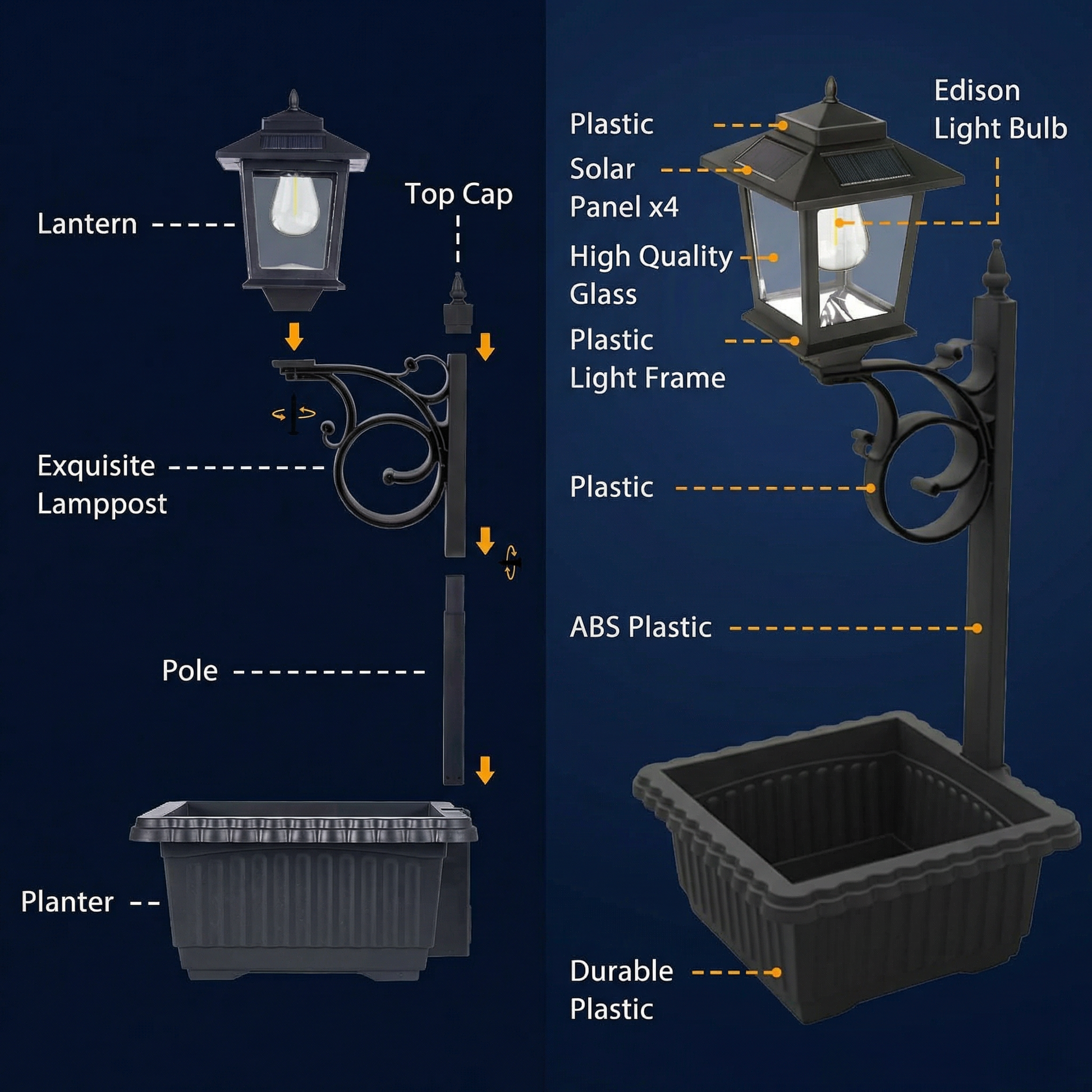 Most outdoor lights are just lights — plain, single-purpose, and forgettable. The Elaris Solar Lantern Planter is a complete outdoor décor statement: a solar-powered lamp post, a flower planter, and a weather-resistant fixture all in one. No wiring, no hassle, no compromises.